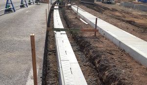 土留機能を兼ね備えた可変側溝。ボルト連結とシール材で目地の手間を軽減できる。無騒音タイプ。