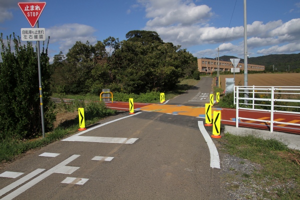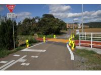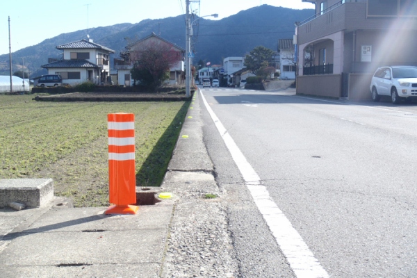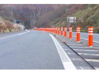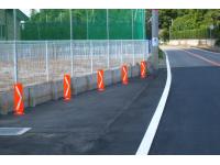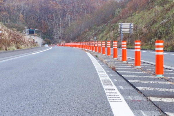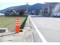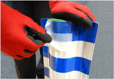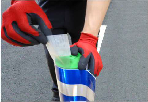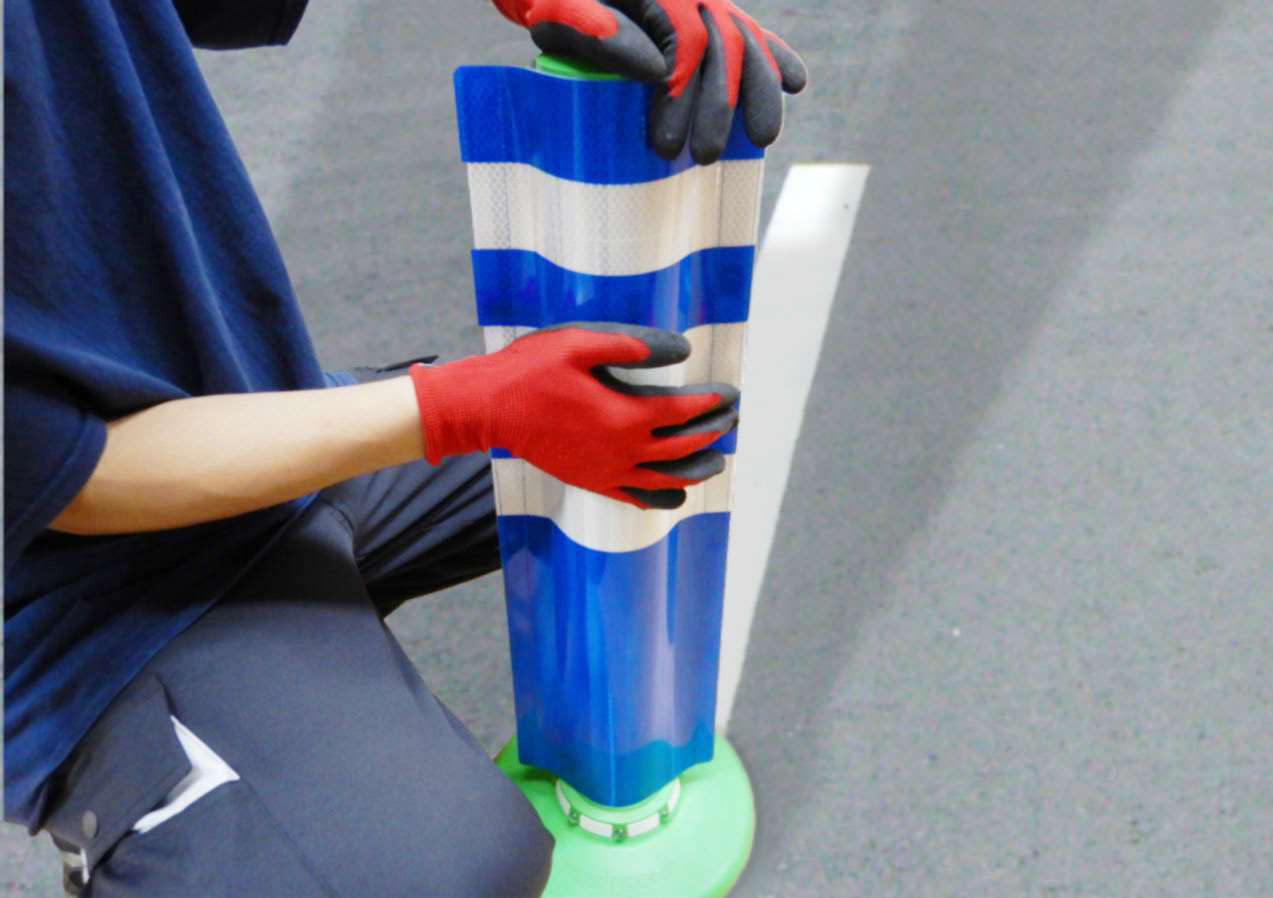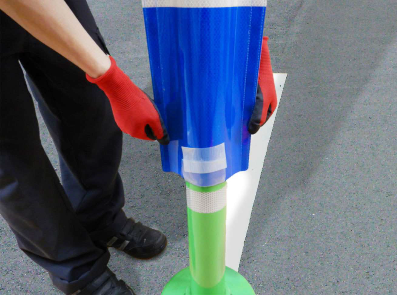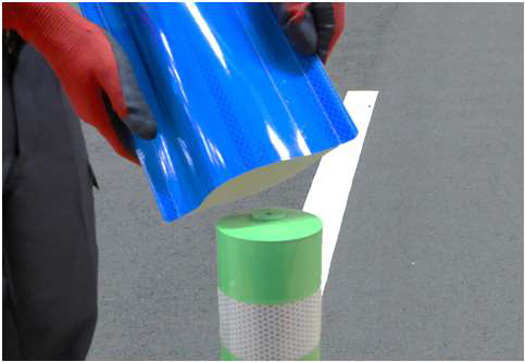 剥離紙を上部から引っ張り、両面テープを車線分離標本体に貼り付ける