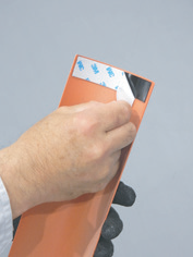 カバー内側の両面テープの剥離紙を剥がし(3 箇所ずつ)、センター線に合わせて支柱に押し付ける(両面)。