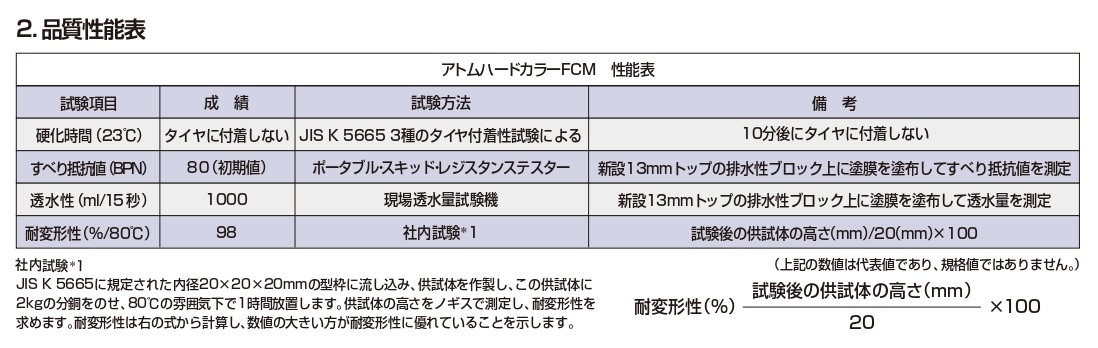 塗料中に硬質骨材が含まれ、さらに施工時に硬質骨材を散布することにより初期および経時で高いすべり抵抗が得られる。