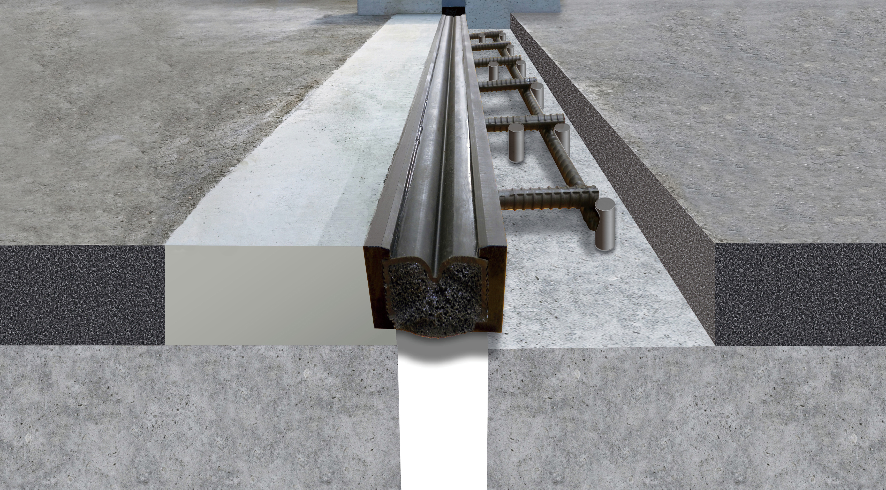 - 鋼製コーナーチャンネルと高性能シールゴムを組み合わせた堅牢な構造であり、アンカー固定と裏込めコンクリートにより床版との一体化を実現する。