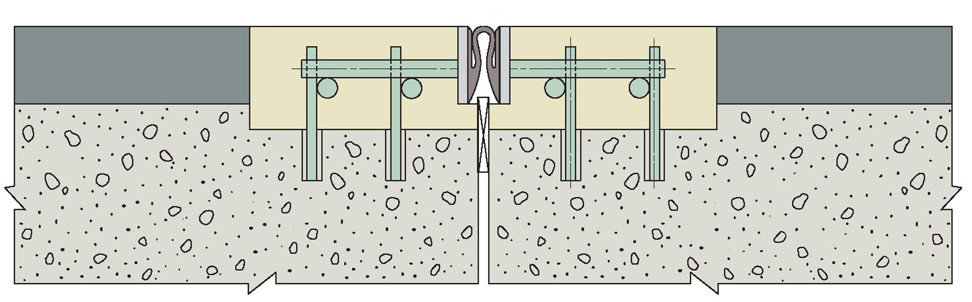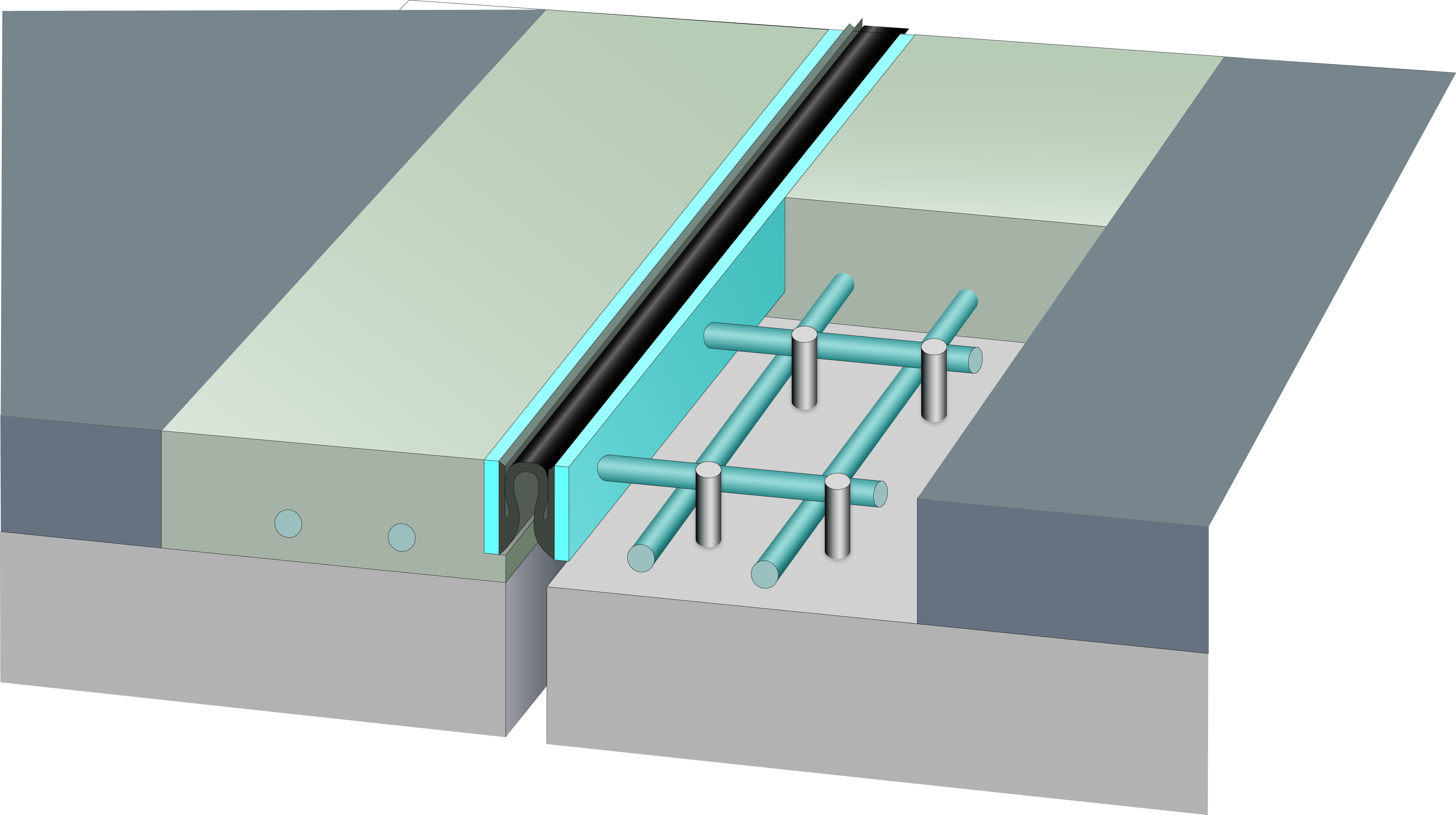 - 縦目地専用の突き合わせ型ゴム製伸縮装置である。逆U字形状のシールゴムがガードプレートに加硫接着されており、鉛直・橋軸方向の変位に柔軟に追随する。装置本体はアンカーボルトを介して床版と一体化され、構造安定性を有する。