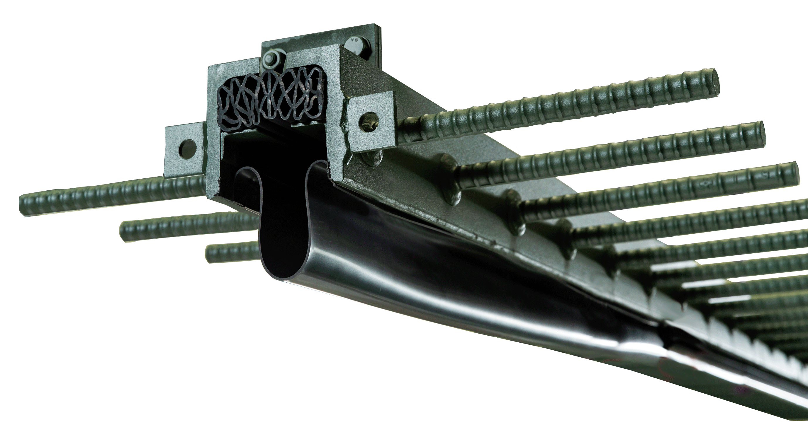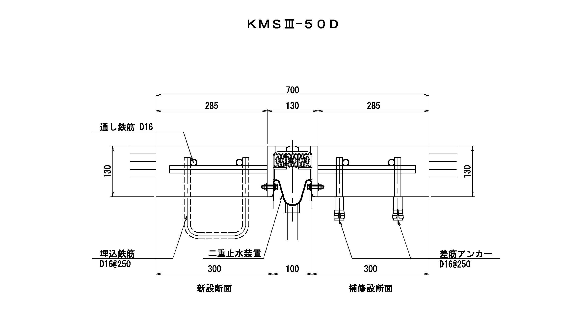 - 形鋼製の本体と定着構造のアンカーバー、一次止水ゴム、二重止水構造で構成された床版定着方式の伸縮装置。シンプルな縦型・三角歯型形状で止水ゴムの常時圧縮設置により高い水密性を実現し二重止水構造を標準装備としている。
