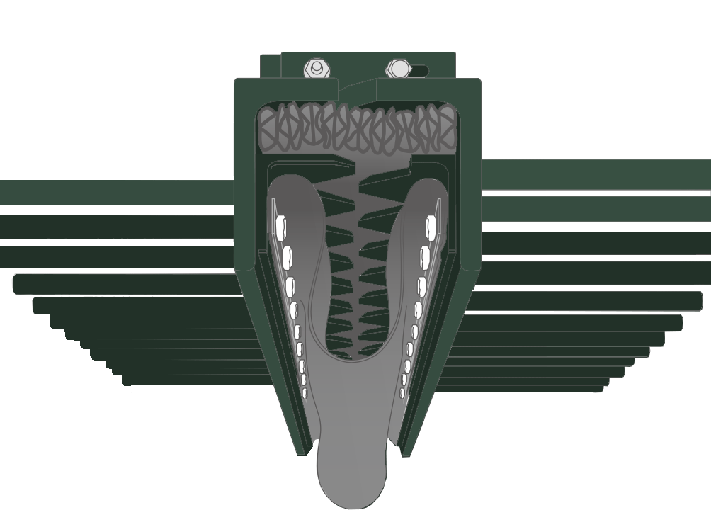 - 形鋼製の本体と定着構造のアンカーバー、止水ゴムを支持するゴム受け歯、一次止水ゴム、二重止水構造で構成された床版定着方式の伸縮装置。シンプルな縦型・三角歯型形状で止水ゴムの常時圧縮設置により高い水密性を実現し二重止水構造を標準装備している。