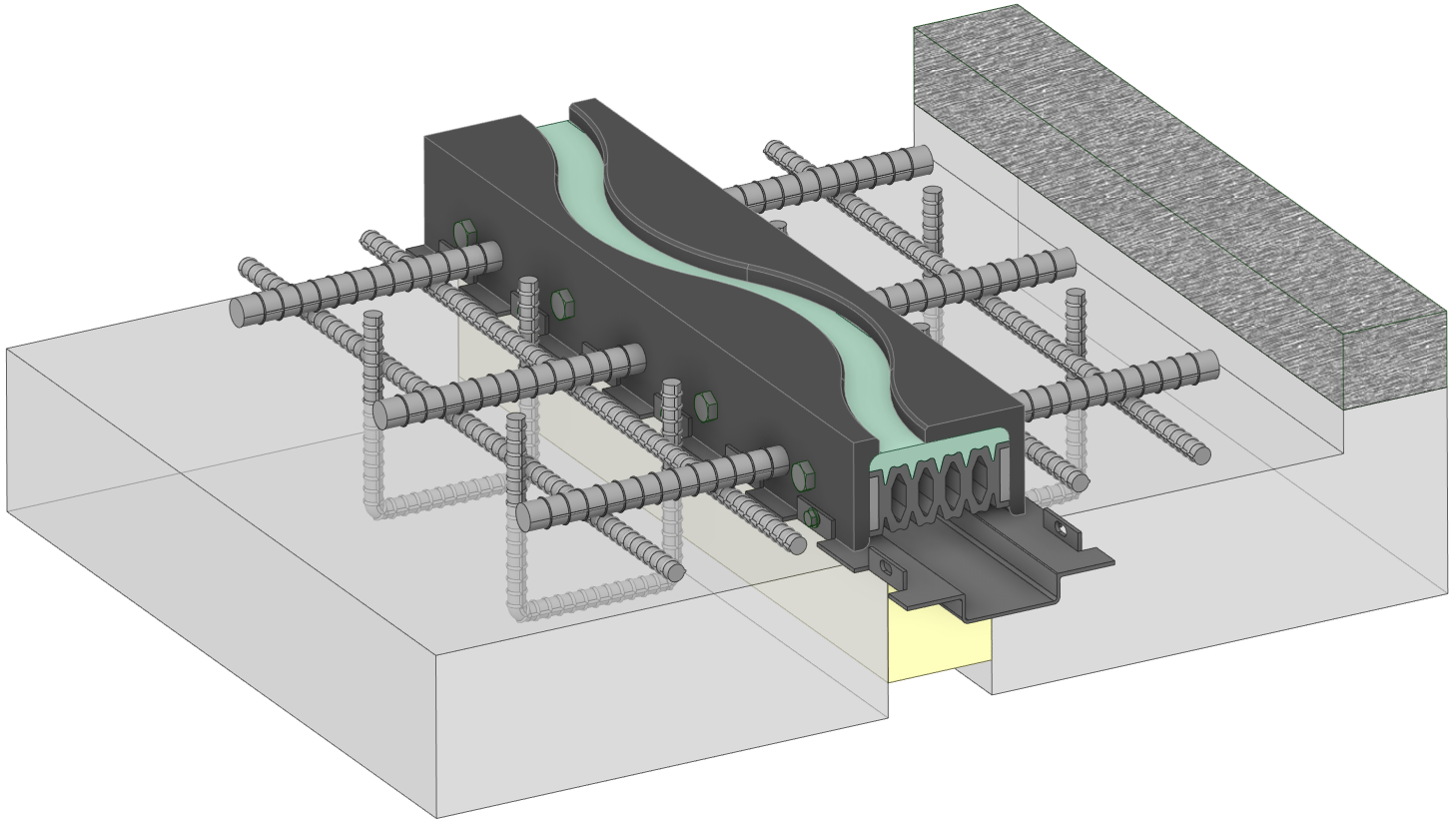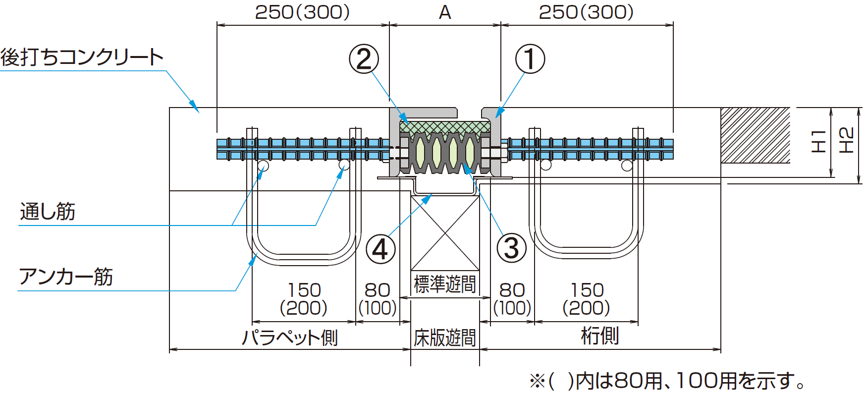 - 波形のフェイスプレートで荷重を受け、翼鉄筋で定着する構造である。また、ジョイント遊間部のゴムパッキンが車両通過時の繰り返し衝撃を緩和する。