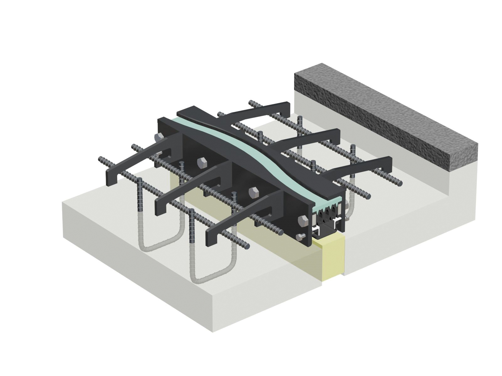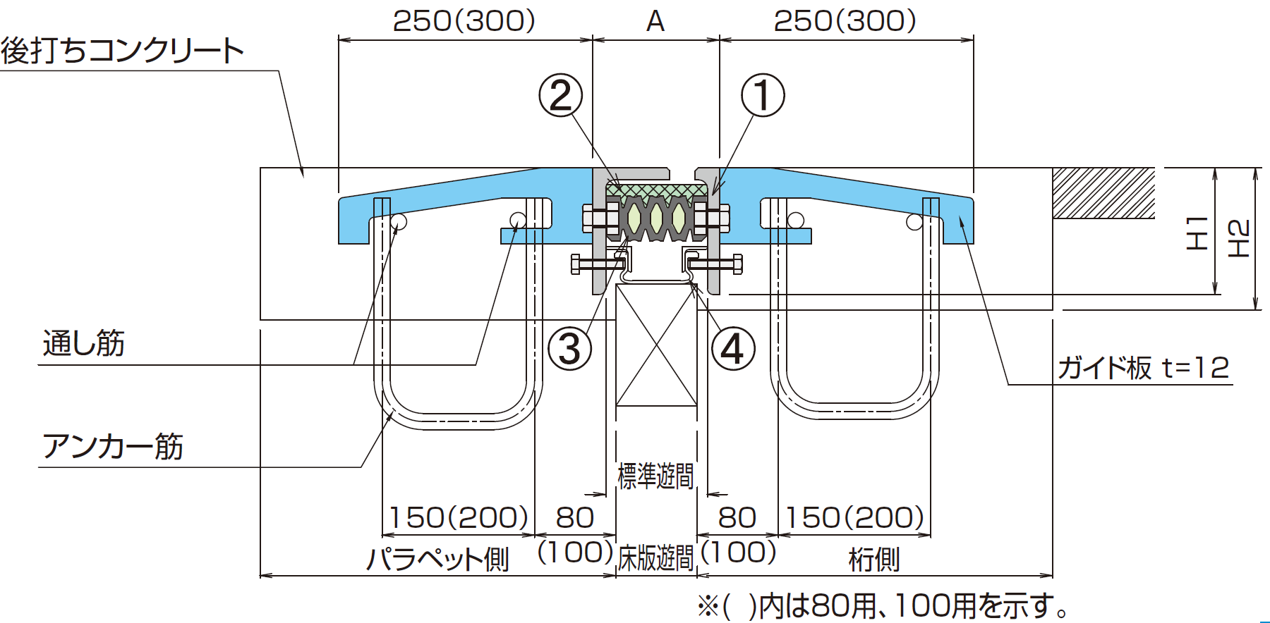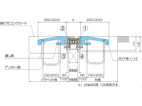 - 波形のフェイスプレートで荷重を受け、翼鉄筋で定着する構造である。また、ジョイント遊間部のゴムパッキンが車両通過時の繰り返し衝撃を緩和する。