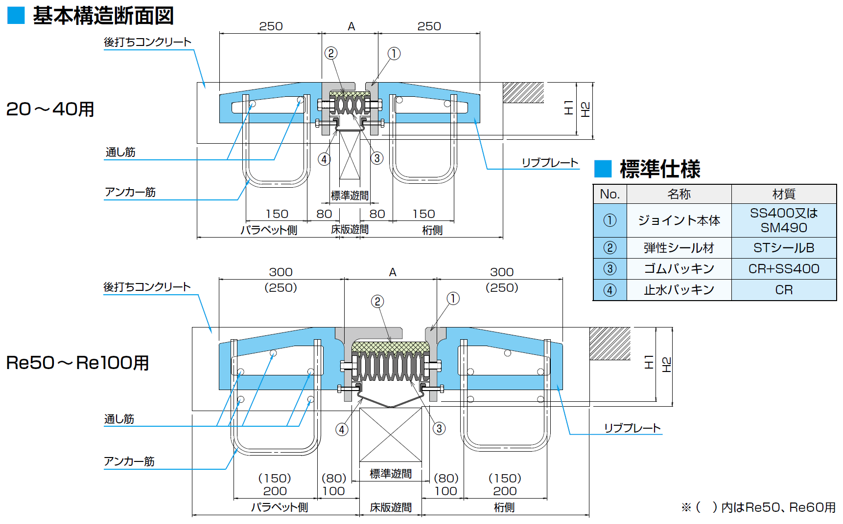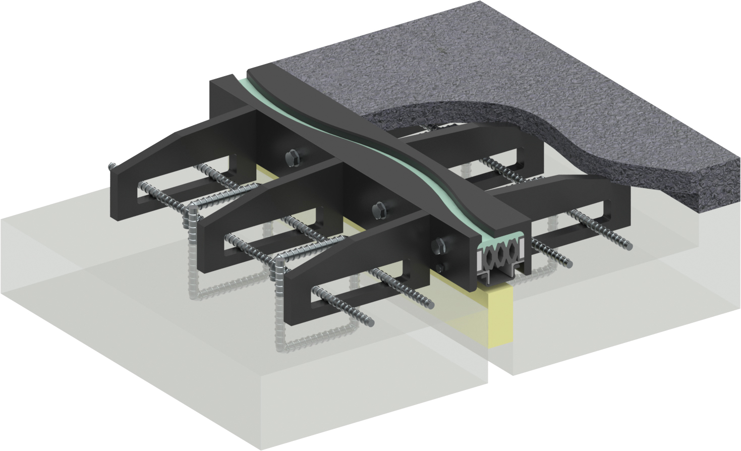 - 波形のフェイスプレートで荷重を受け、翼鉄筋で定着する構造である。また、ジョイント遊間部のゴムパッキンが車両通過時の繰り返し衝撃を緩和する。