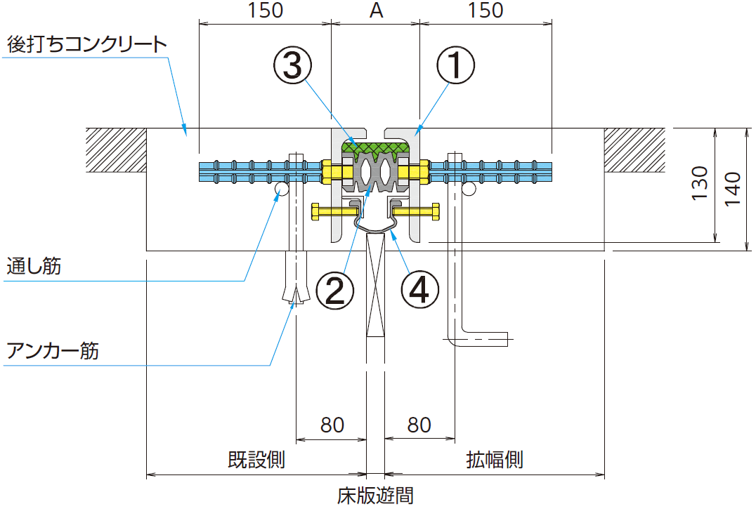 - シンプルな構造で既設部と拡幅部の段差を吸収できる。フェイスプレートの下には弾性シール材とボルト固定されたゴムパッキンがあり止水性に優れる。