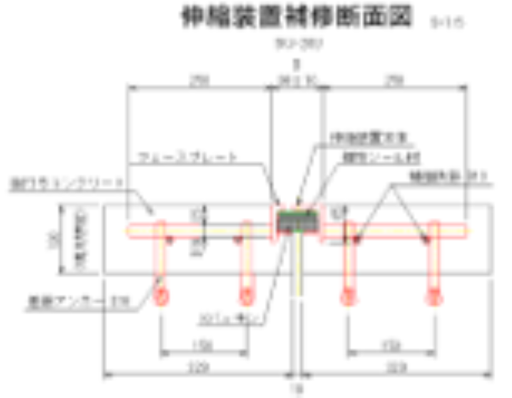 - 本体は鋼製、弾性シール材+伸縮パッキンで構成、伸縮装置表面のフェースプレートが荷重支持している。本体翼筋を床版アンカー筋に定着してコンクリート内部に埋め込む構造である。