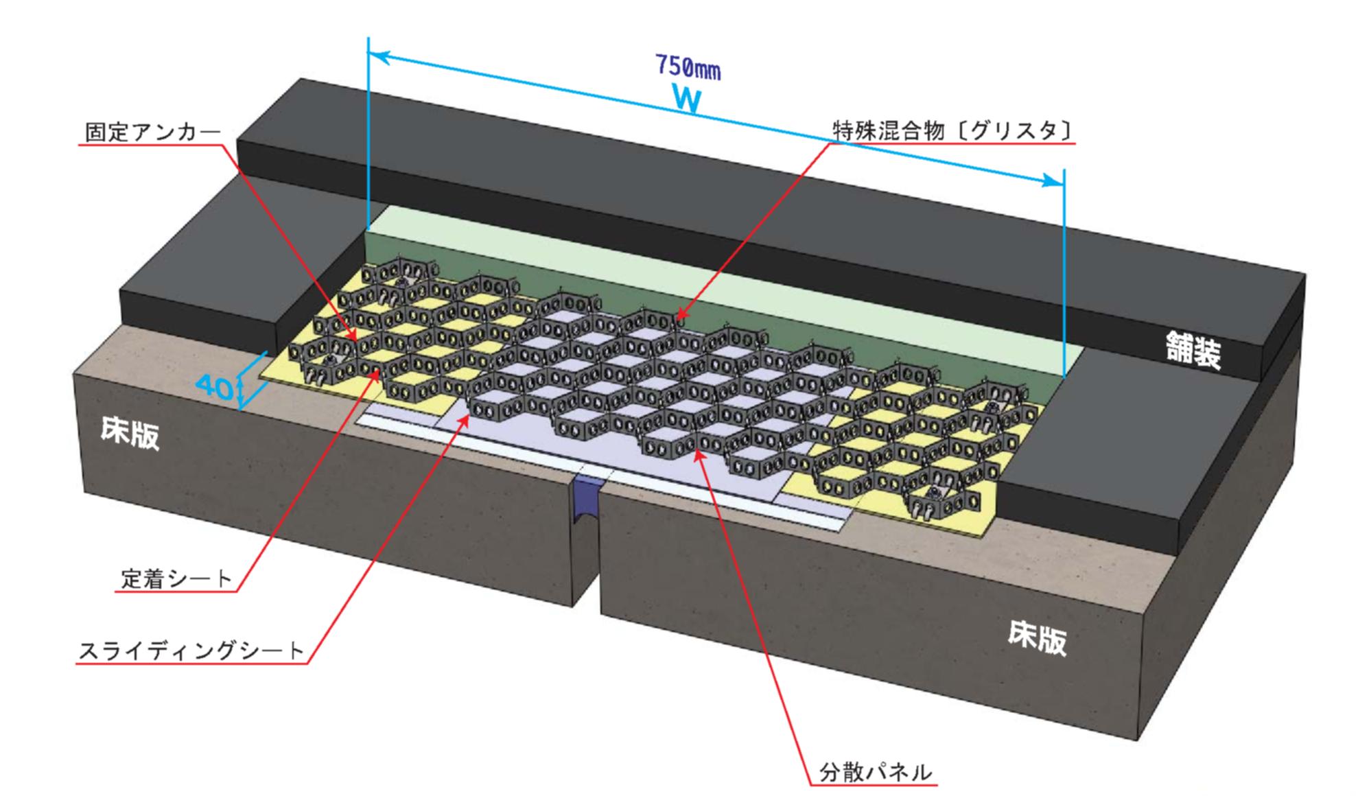- 2枚重ねの瀝青シートを床版と舗装体の境界面に敷設することによってセン断層を設け両者の動きを完全に分離させ、鋼製六角パネルとアスファルト混合物との複合体で桁の伸縮変位を舗装体に広く分散・吸収させる。
