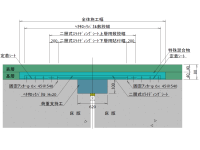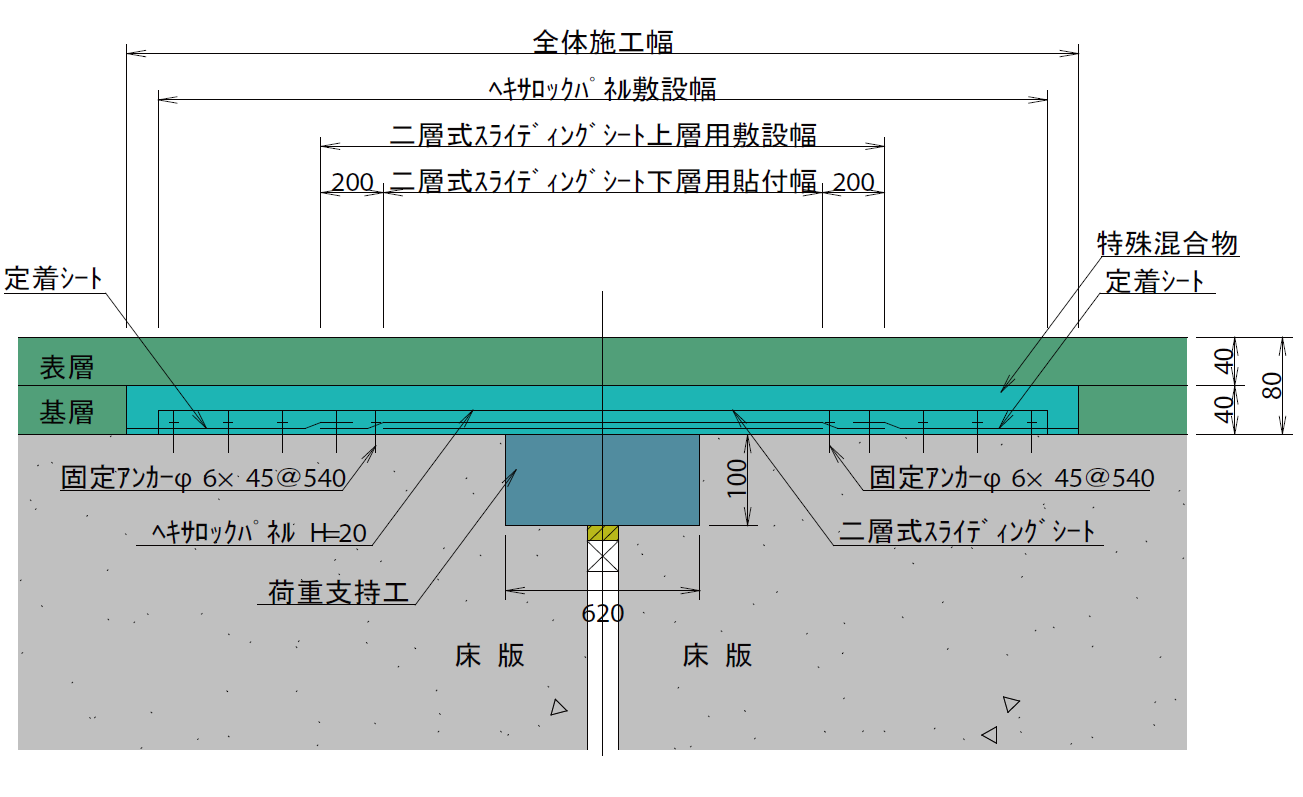 - 遊間部は特殊弾性樹脂を充填。床板面に貼付するスライディングシートは防水層としての役割も兼用。基層のグースアスファルトは水密性が高い。