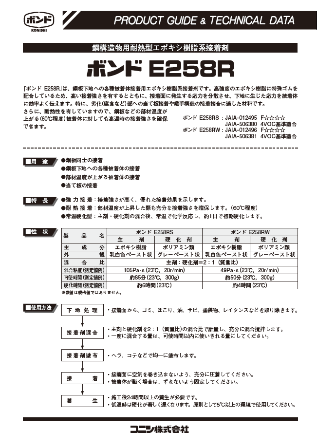 鋼板下地への各種被着体接着用エポキシ樹脂系接着剤。 高強度のエポキシ樹脂に特殊ゴムを配合しているため、高い接着強さを有するとともに、接着面に発生する応力を分散させ、下地に生じた応力を被着体に効率よく伝え、特に、劣化(腐食など)部への当て板接着や継手構造の接着接合に適した材料である。 さらに、耐熱性を有していますので、鋼板などの部材温度が上がる(60℃程度)被着体に対しても高温時の接着強さを確保できる。