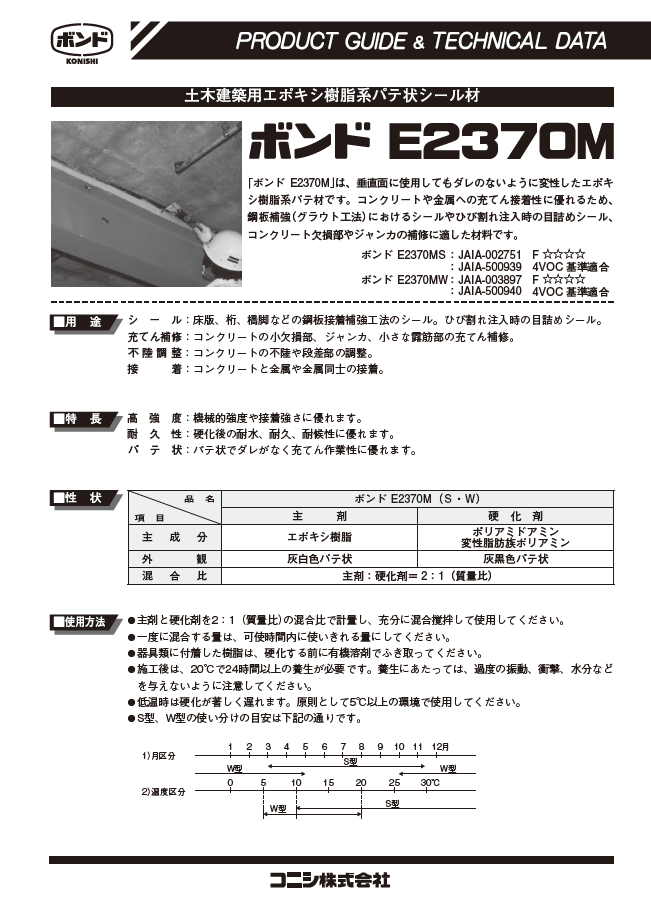 垂直面に使用してもダレのないように変性したエポキシ樹脂系パテ材。 コンクリートや金属への充てん接着性に優れるため、鋼板補強(グラウト工法)におけるシールやひび割れ注入時の目詰めシール、コンクリート欠損部やジャンカの補修に適した材料である。