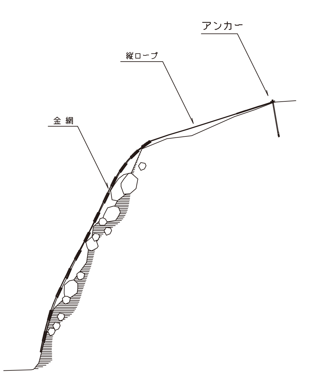 落石発生のおそれがある斜面上の岩石を斜面全体で覆った金網・ワイヤロープ、地山の摩擦力により落石エネルギーを吸収し法尻に岩石を誘導する工法。