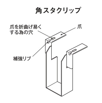 両側の壁に取り付けたランナーに角スタッドを差し込む天井において、スパン中間部でのたわみ抑制のため、吊り下げられた野縁受けを角スタッドに固定するために使用される金具。