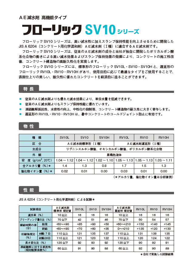 標準形のフローリックSV10L・SV10・SV10H と、遅延形のフローリックRV10L・RV10・RV10H があり、使用目的に応じて最適なタイプをご使用することで、表面仕上りの美しい、耐久性に優れたコンクリートを経済的に造ることができる。