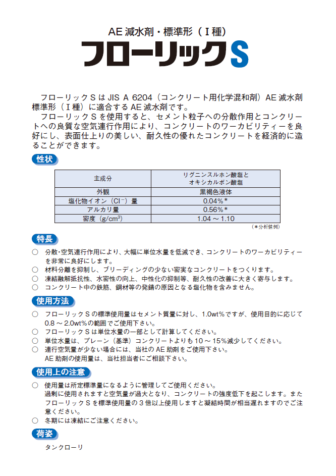 JIS A 6204(コンクリート用化学混和剤)AE 減水剤標準形(Ⅰ種)に適合するAE 減水剤。 フローリックS を使用すると、セメント粒子への分散作用とコンクリートへの良質な空気連行作用により、コンクリートのワーカビリティーを良好にし、表面仕上りの美しい、耐久性の優れたコンクリートを経済的に造ることがでる。