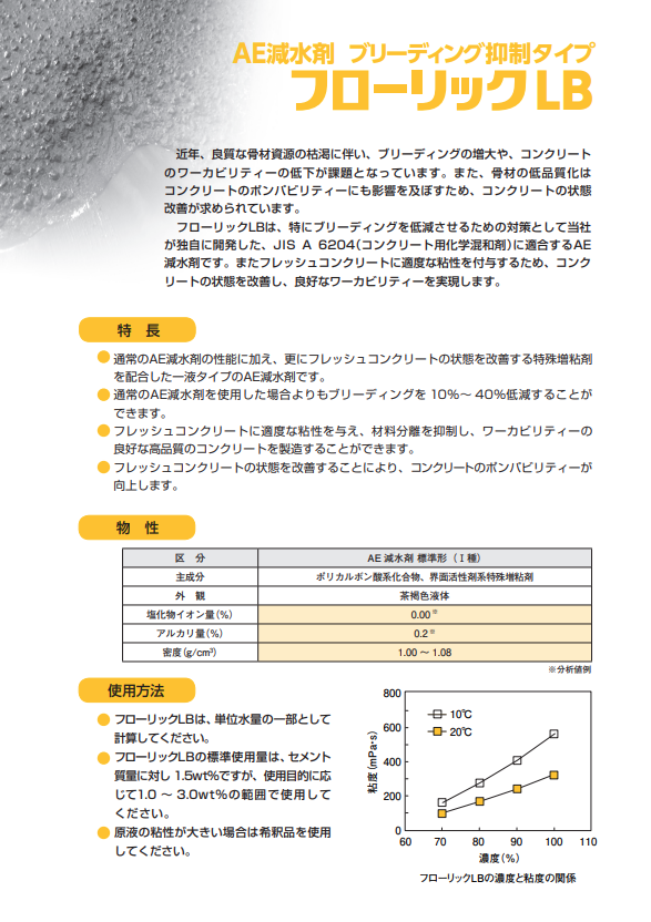 ブリーディングを低減させるための対策として当社が独自に開発した、JIS A 6204(コンクリート用化学混和剤)に適合するAE減水剤。 フレッシュコンクリートに適度な粘性を付与するため、コンクリートの状態を改善し、良好なワーカビリティーを実現する。