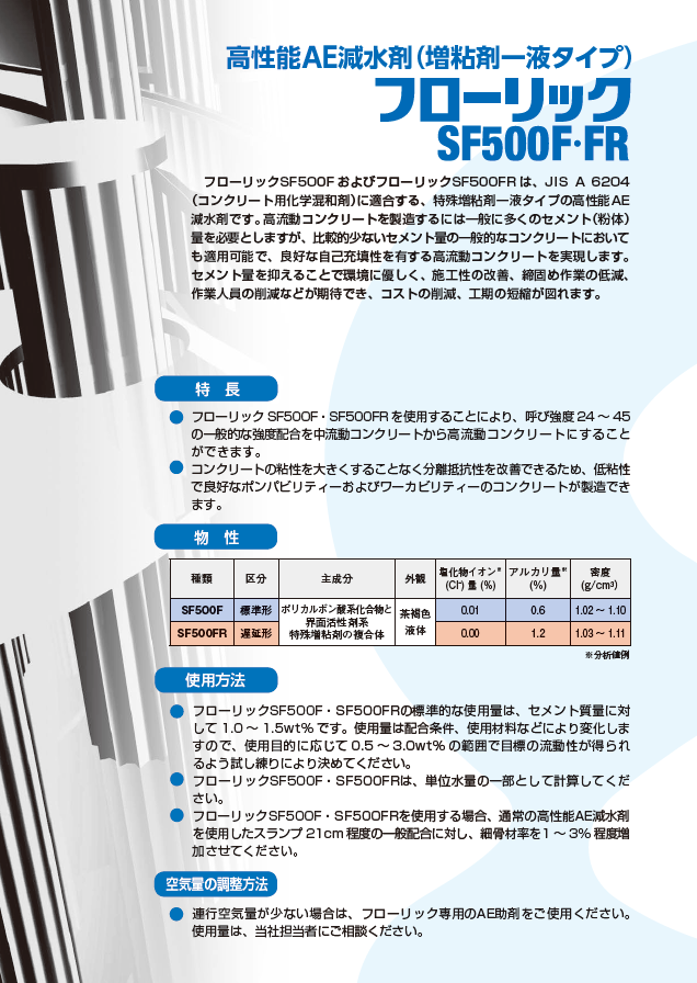 JIS A 6204(コンクリート用化学混和剤)に適合する、特殊増粘剤一液タイプの高性能AE減水剤。高流動コンクリートを製造するには一般に多くのセメント(粉体)を必要とするが、比較的少ないセメント量の一般的なコンクリートにおいても適用可能で、良好な自己充填性を有する高流動コンクリートを実現できる。 セメント量を抑えることで環境に優しく、施工性の改善、締固め作業の低減、作業人員の削減などが期待でき、コストの削減、工期の短縮が図れる。