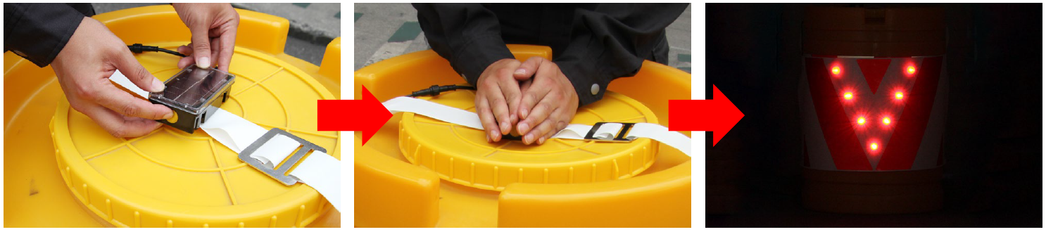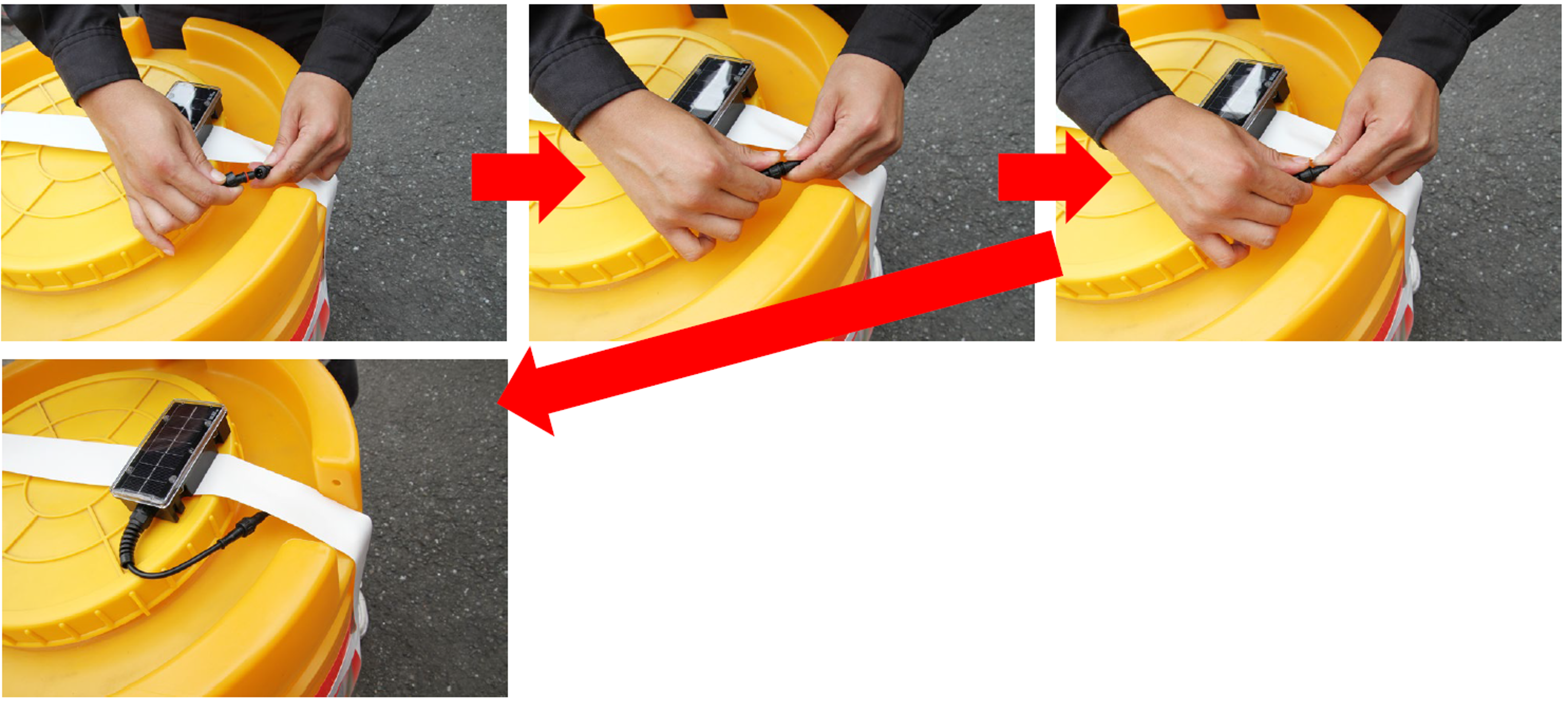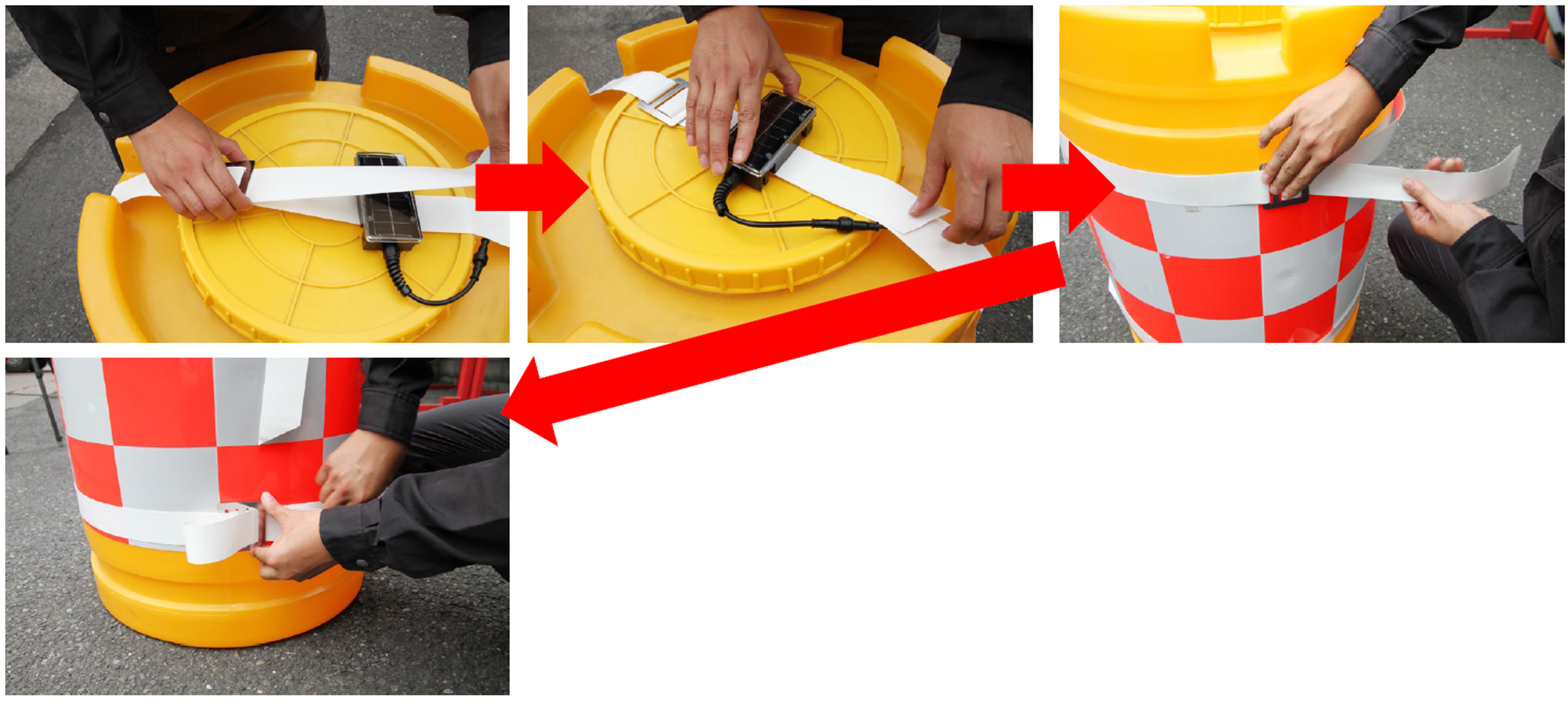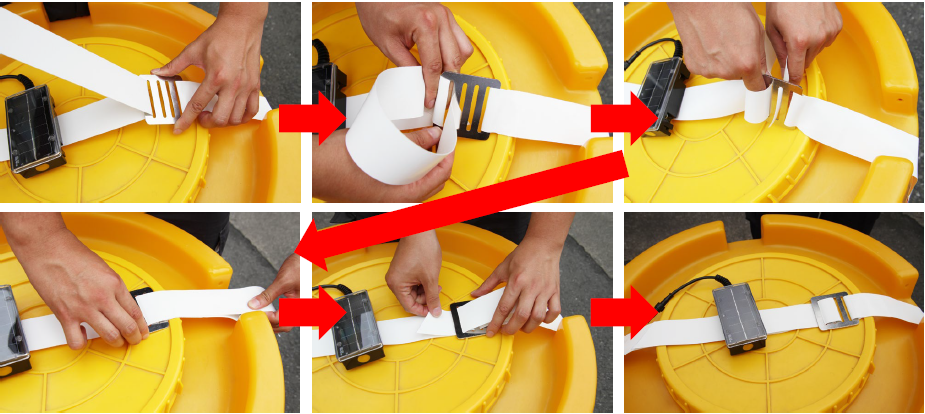 ソーラー部の裏面にあるベルト通しにベルトを通す。この時、ソーラー部の向きは側面の電源スイッチが前面(発光部)の方を向くように設置する。
