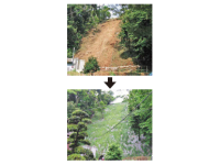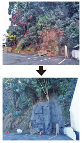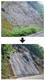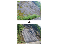 ・風化・浸食等により亀裂の発達した岩塊・岩盤に対して、高強度のポリマーセメントモルタルを斜面全体に薄層被覆することにより、岩表面の細かな亀裂に注入・充填接着され、被覆の一体化により表層の剥離や欠落を予防する。