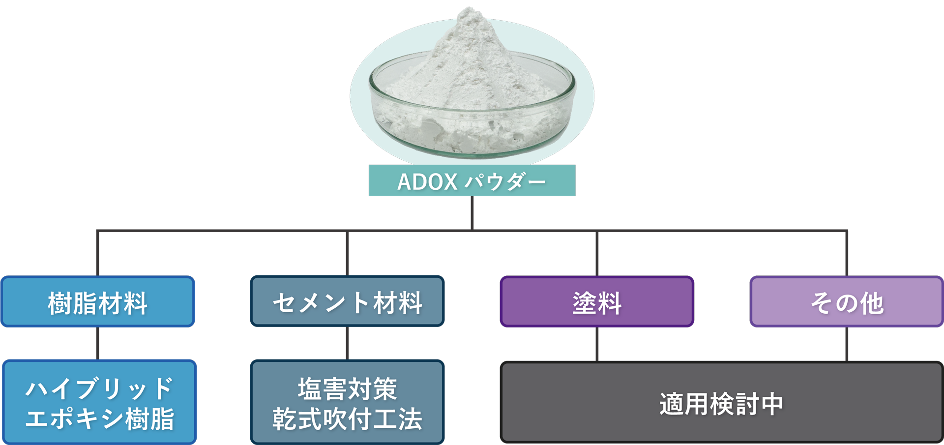 ADOXパウダーは、高い陰イオン吸着性能を持つ無機系イオン吸着材である。 パウダー自身が保持するイオンと周囲の目的イオンを交換するイオン交換機構により対象物質を効率的に吸着する。 さらに、独自に開発した合成プロセスを採用することで従来材料と比較し低濃度領域における吸着性能が著しく向上する。