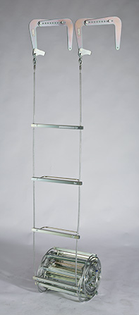 当社では鉄製の折りたたみ式とワイヤーロープ式、アルミベースのOAシリーズ(折りたたみ式のみ)、そして定置化を企図した揺れにくいSOSとminiSOSを販売。最大10mまで対応。高さが10mを超える場合は緩降機・救助袋・固定はしごを利用。義務設置の場合、つり下げはしごは原則として3階までしか設置できない。最下段の横桟から地面等の降着面までは50cm以内に収める必要がある。