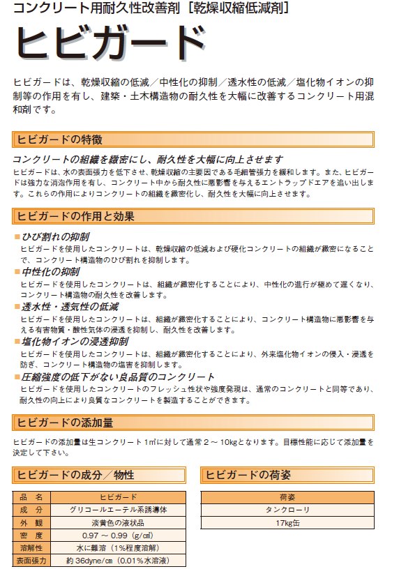 乾燥収縮の低減/中性化の抑制/透水性の低減/塩化物イオンの抑制等の作用を有し、建築・土木構造物の耐久性を大幅に改善するコンクリート用混和剤。