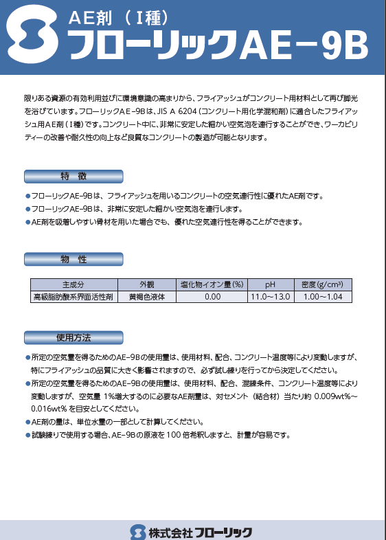 フ ロ ー リッ クAE-9Bは、JIS A 6204(コンクリート用化学混和剤)に適合したフライアッシ ュ 用 AE剤( Ⅰ種 )。 コ ン ク リ ー ト 中 に 、非 常 に 安 定 し た 細 か い 空 気 泡 を 連 行 す る こ と が で き 、ワ ー カ ビ リティーの改善や耐久性の向上など良質なコンクリートの製造が可能となる。