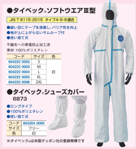 タイベックソフトウェアⅢ型 ・縫い目にテープを接着し、バリア性を向上 ・袖が上に上がらないサムループ付 ・使い捨て式