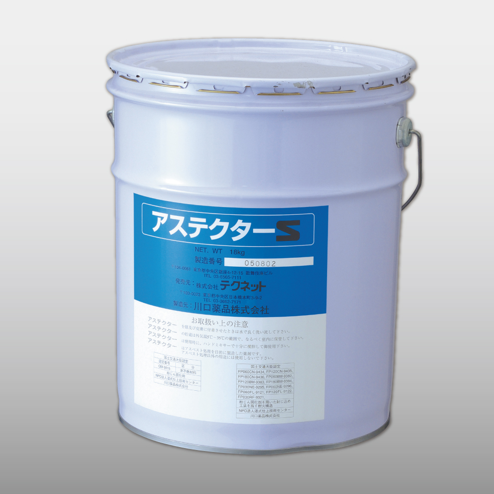 浸透性に優れ、吹付けるだけで石綿繊維を結束し、内部まで固化・封じ込める。 ●石綿吹付材料の厚さが30mm以上でも深く浸透し、石綿繊維を固く結束する ●希釈倍率を変えると、内部浸透処理/表面固化処理/除去工事の際の飛散抑制剤として使用可能である