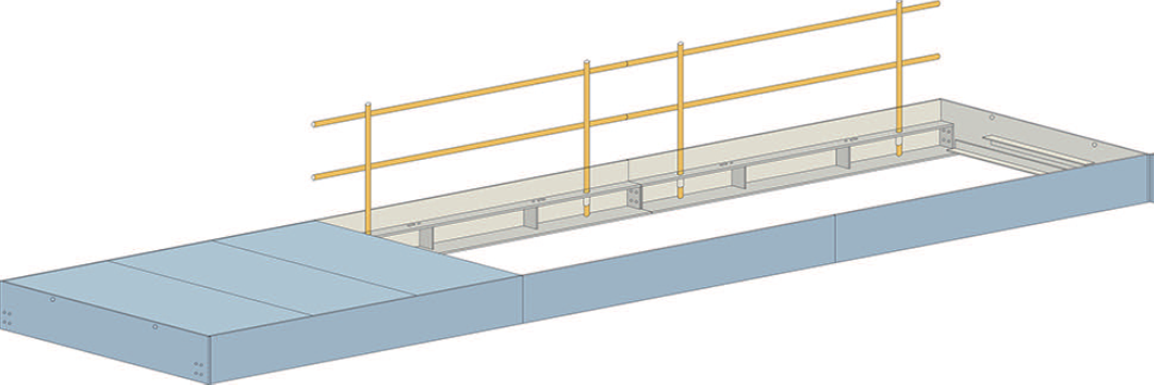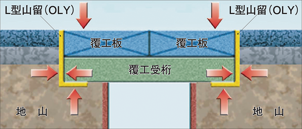 覆工板を横並びに置き、OLYの上に直接覆工板を設置する。従来の標準形式のOLYと異なり、受桁が不要となるため、浅い埋設物、構造物への対応が可能となった。