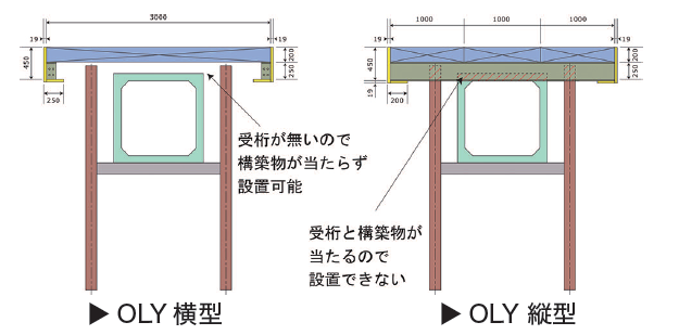 従来の標準形式のOLY と異なり、受桁が不要となるため、浅い埋設物、構造物への対応が可能となった。