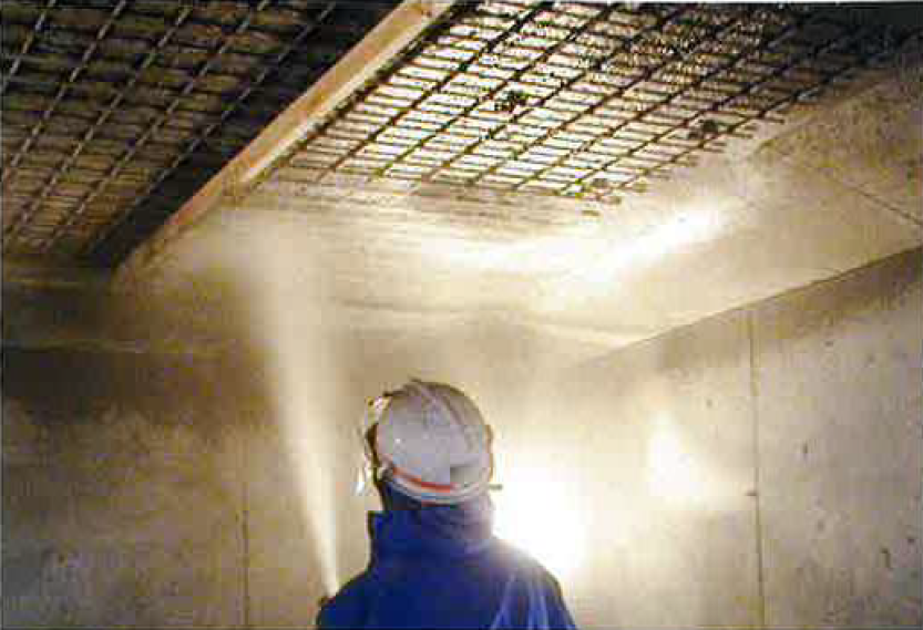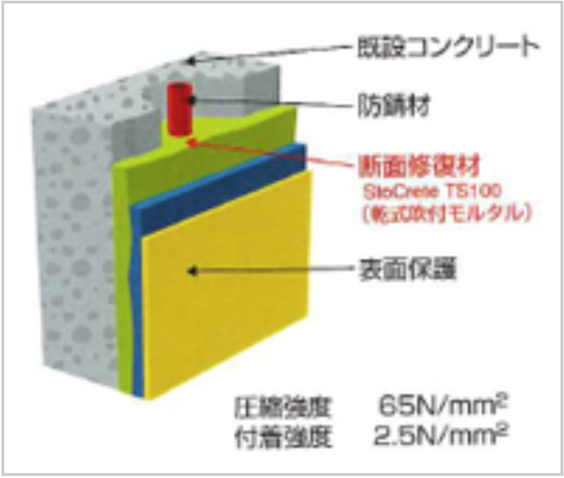 構造物の延命・長寿命化に最適な 〔乾式吹付工法〕 は、吹付ける直前のホース内で水と特殊ポリマーセメントモルタルStoCrereTS100を混合し、既設構造物に吹付ける工法。従来の補修・補強工事に比べて施工費用が下がり、大幅に工期を短縮できる。