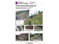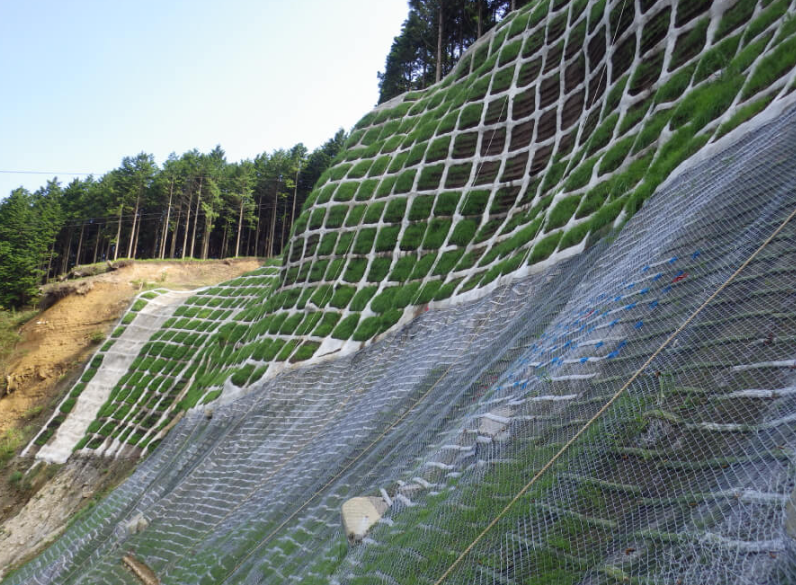 不安定になりがちな急勾配のり面をソイルクリートで保護しながら「勾配緩和網」の設置により確実な緑化が可能になる。