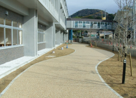 ゴムチップを骨材として用い、結合材にウレタン樹脂を用いた混合物を現場で舗設する。公園などの遊具...