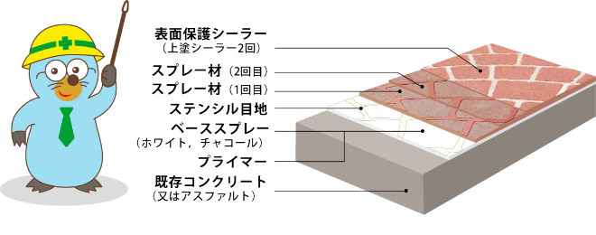 複数色での吹き分けや、ステンシル目地を使用した標準タイプ、テープ目地を使った安価なタイプなど、デザインの選択が可能。