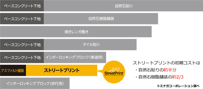 自然石貼りの約50%、自然石樹脂舗装の約65%の価格で導入が可能となり、