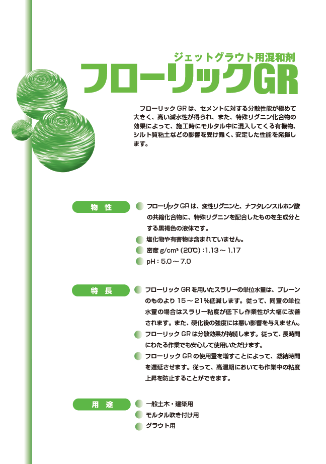 セメントに対する分散性能が極めて大きく、高い減水性が得られ、また、特殊リグニン化合物の効果によって、施工時にモルタル中に混入してくる有機物、シルト質粘土などの影響を受け難く、安定した性能を発揮する。