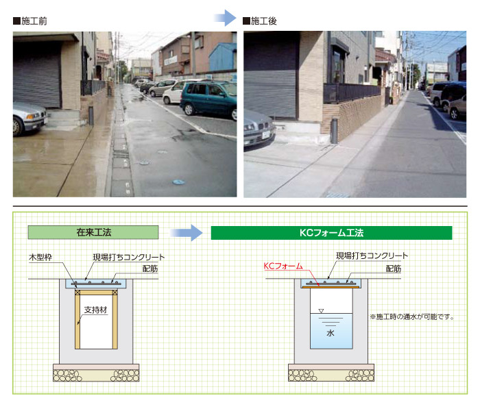 側溝と一体化されることにより、落蓋等で発生する振動音が発生しない。