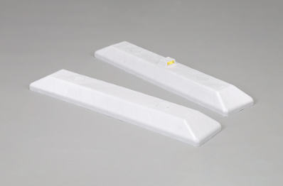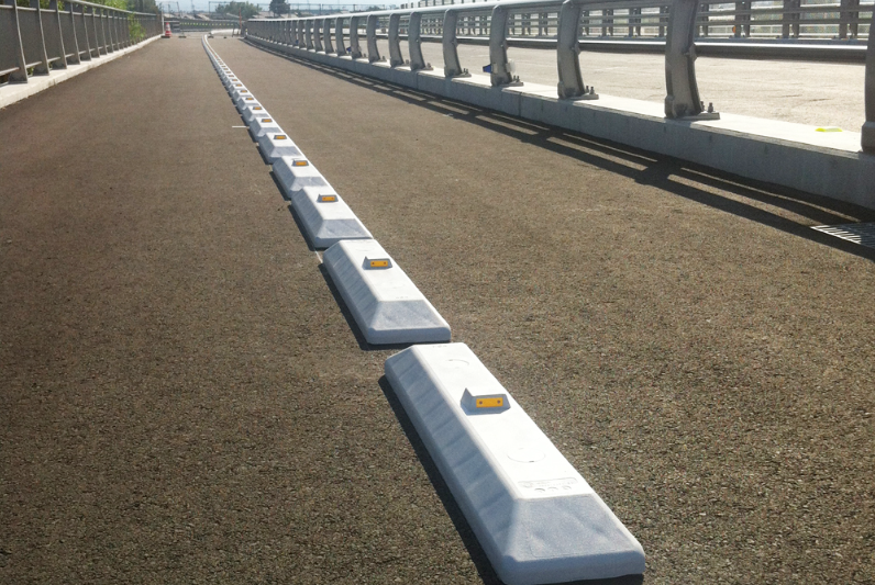 リサイクルが可能な環境にやさしい中央分離帯ブロック(車線規制ブロック)。 専用道路鋲(反射材付き)タイプもある。