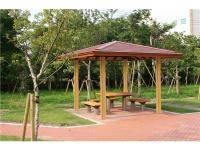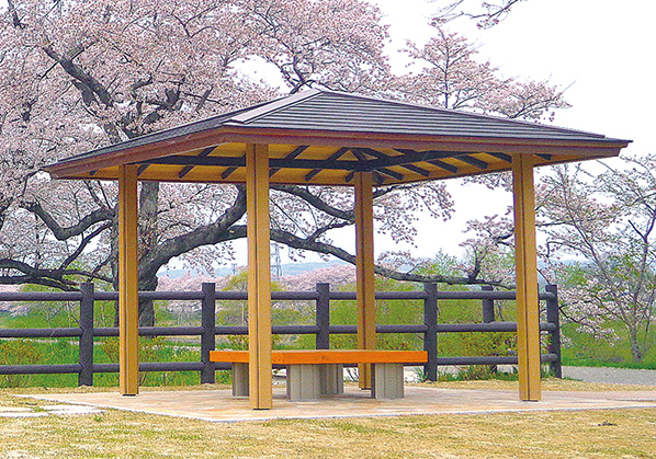 庭園などの休憩所。屋根を四方にふきおろし、壁のない柱だけの小屋。接合金物を使用。