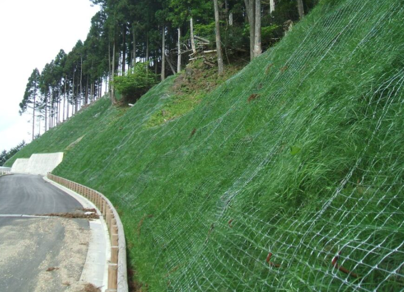 不安定になりがちな急勾配のり面をソイルクリートで保護しながら「勾配緩和網」の設置により確実な緑...