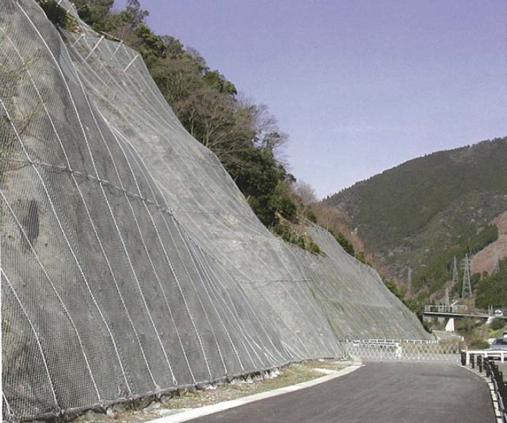 金網とワイヤロープで構成されたネットで法面を完全に覆い、跳石・飛石を防ぐ覆式落石防護網。