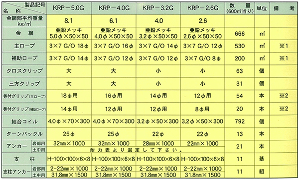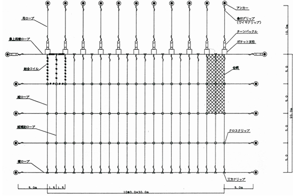 従来のロープネット・マイティーネットの基本構造、主ロープで連結された4本のアンカー...