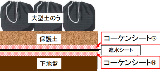 放射性廃棄物の現場保管・仮置き場用 下部保護マット。 優れた遮光性・耐候性・耐貫通性を有するポリエステルスパンボンド不織布で、仮置き場用の保護マットとして利用可能。