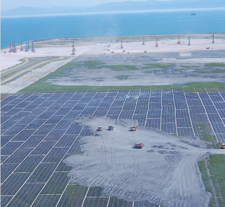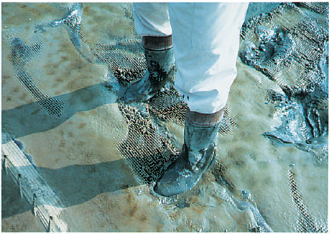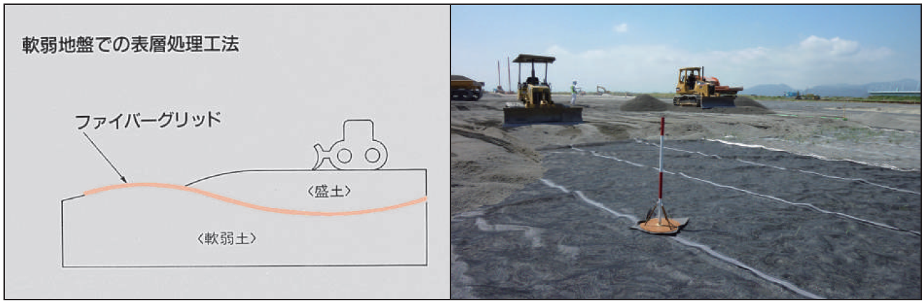 網目構造のため、軟弱土や盛土材とのなじみも良く、また網目を通して上下の土が分断されずに、