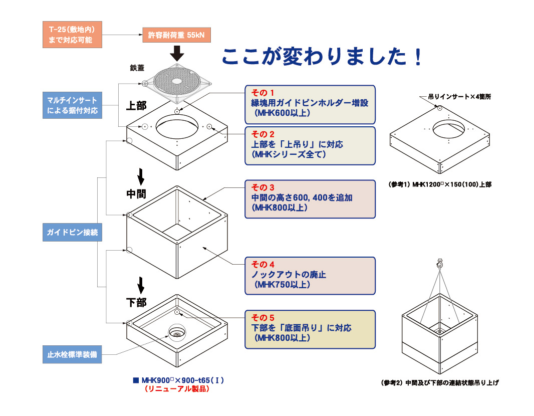 ハンドホール製品は「上吊り対応」についての要望が増えており、上部は「天端面吊り」、