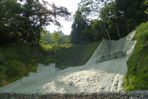 保水材を封入した吸水袋は、降雨時に流下する水を吸水し、膨張。流下水を受け止める小段を形成するこ...