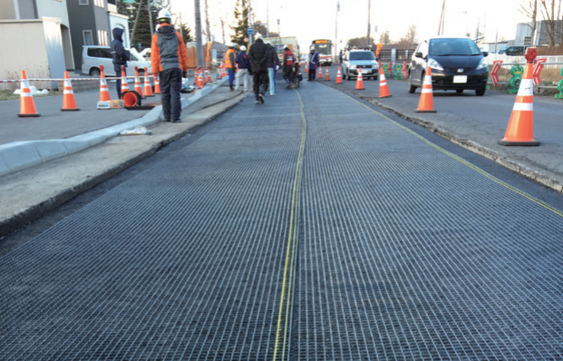 道路のひび割れ(疲労ひび割れやリフレクションクラックなど)の発生を抑制するシート状の素材。アスファルト表層の下に敷設することでひび割れの発生を遅延させることができる。ひび割れの発生を遅延させることができるため、道路の長寿命化にも貢献でき、結果、道路のメンテナンスにかかる費用も抑制することができる。 グリッド裏面に接着剤が塗布されているので、他のグラスグリッド同様、専用プライマーは必要がない。